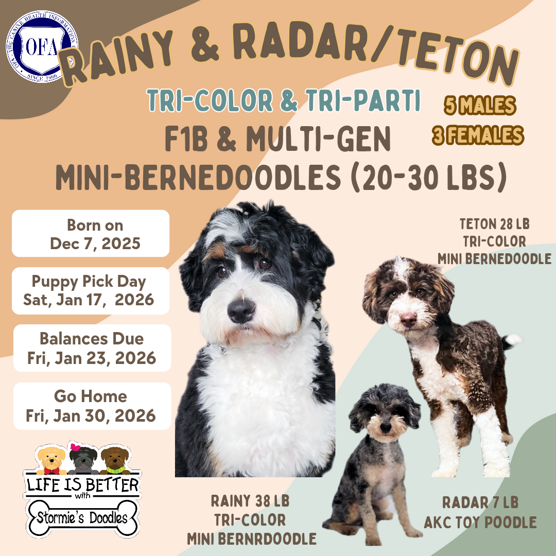 | Rainy & Radar/Teton | Multi-Gen Mini-Bernedoodles (20-30 lbs) Born on Dec 7th, Go Home Jan 30th 4 Males, 3 Females Partis = $2800 +7$ Sales Tax Tri-Colors = $3200 +7% Sales Tax Special Pricing for Unfurnished Puppies Parti Yellow Girl = $1500 +7% Sales Tax Tri-Color Purple Parti Girl = $1800 +7% Sales Tax